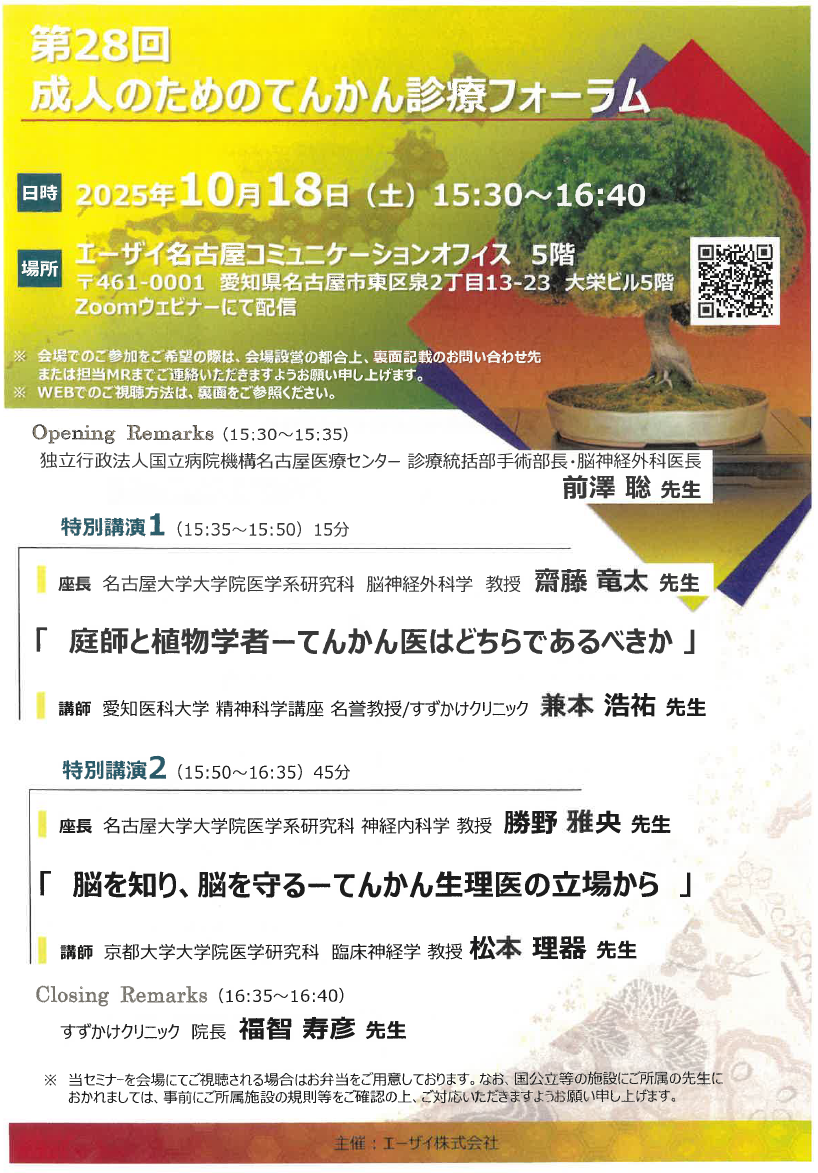 2025年10月18日(土)15:30~16:40に『第28回成人のためのてんかん診療フォーラム』が開催されます。
